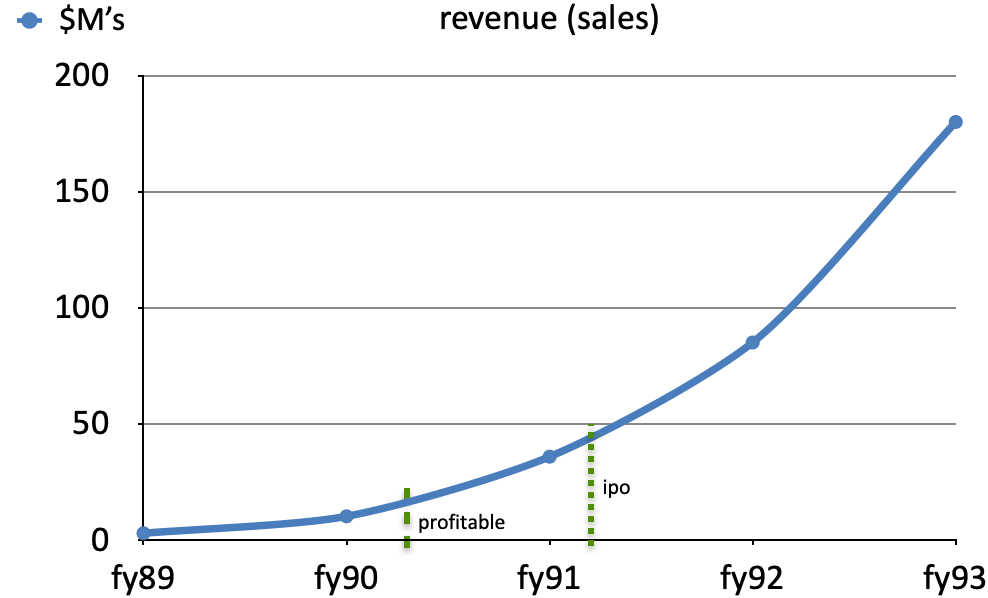 We achieved profitability in the summer of 1990 and started discussing our plans for an Initial Public Offering in the following year. Thanks to Gary Bowen’s sales leadership and outstanding execution by the field organization, we were building a backlog that was growing every month. We were convinced that the timing to go public was right, so we began to staff up the company to become a public entity.