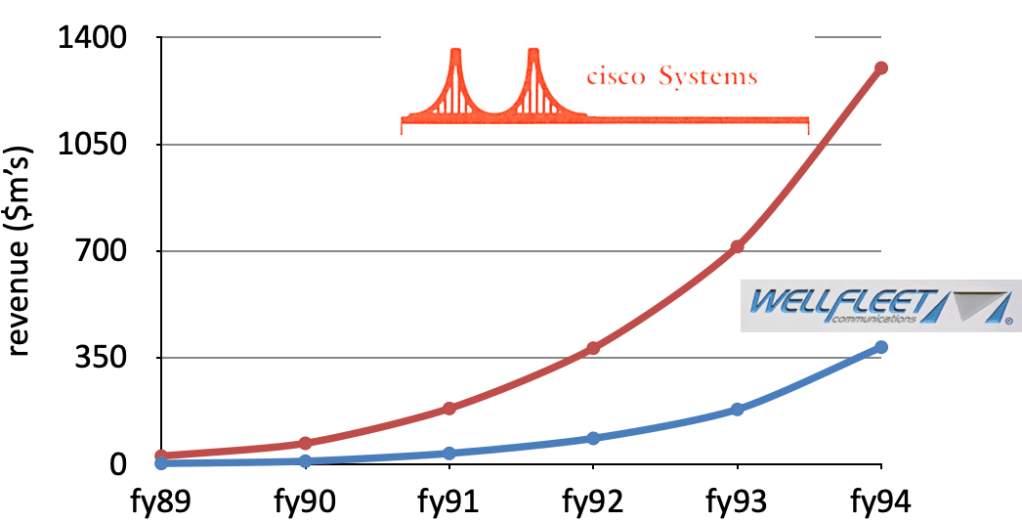 The first graph shows the revenue growth of Cisco and Wellfleet for their respective fiscal years 1989-1994. The second breaks down the total market by share for Cisco, Wellfleet and “others”. In the two years shown (1991 and 1993), Wellfleet grew its share of the router market from 9% to 14% when the overall market was growing at a CAGR (Compound Annual Growth Rate) of 30%. Phenomenal growth for any industry!
