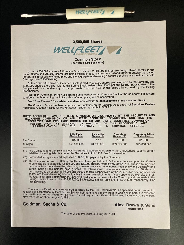 Ultimately, Sev and Steve Cheheyl recommended to the board, who subsequently approved, two lead investment banks – Goldman Sachs and Alex Brown & Sons.. A team of bankers, lawyers and accountants was assigned the task of drafting the prospectus. The purpose of a prospectus is to provide prospective buyers of Wellfleet shares information concerning the company’s core technology, products and services, market segments, risk factors, management roles and responsibilities, and financial results to date. The management committee was assigned the task of reviewing the draft prospectus, offering comments and corrections where appropriate.